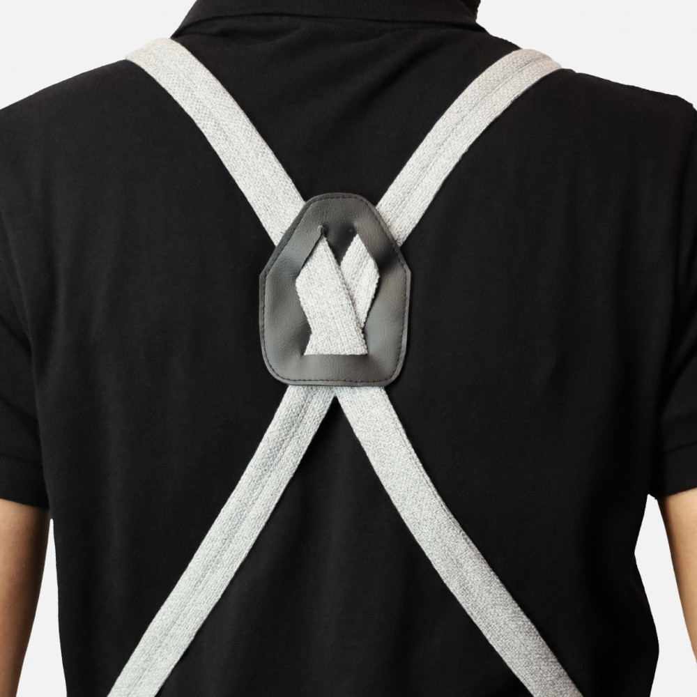ارتقِ بمظهرك الاحترافي مع مريلة اللون الرصاصي الفاتح بتفاصيل الجلد الأسود التي تجمع بين الأناقة الكلاسيكية والعملية الحديثة.